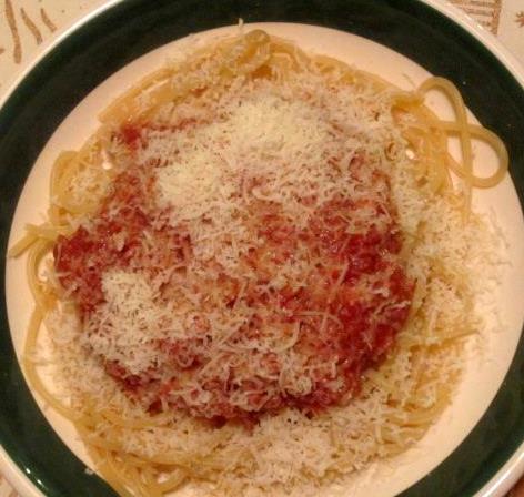 For us this is a bowl of comfort. Just a homemade classic red meat sauce over good pasta, topped with freshly grated Parmigiano-Reggiano cheese.